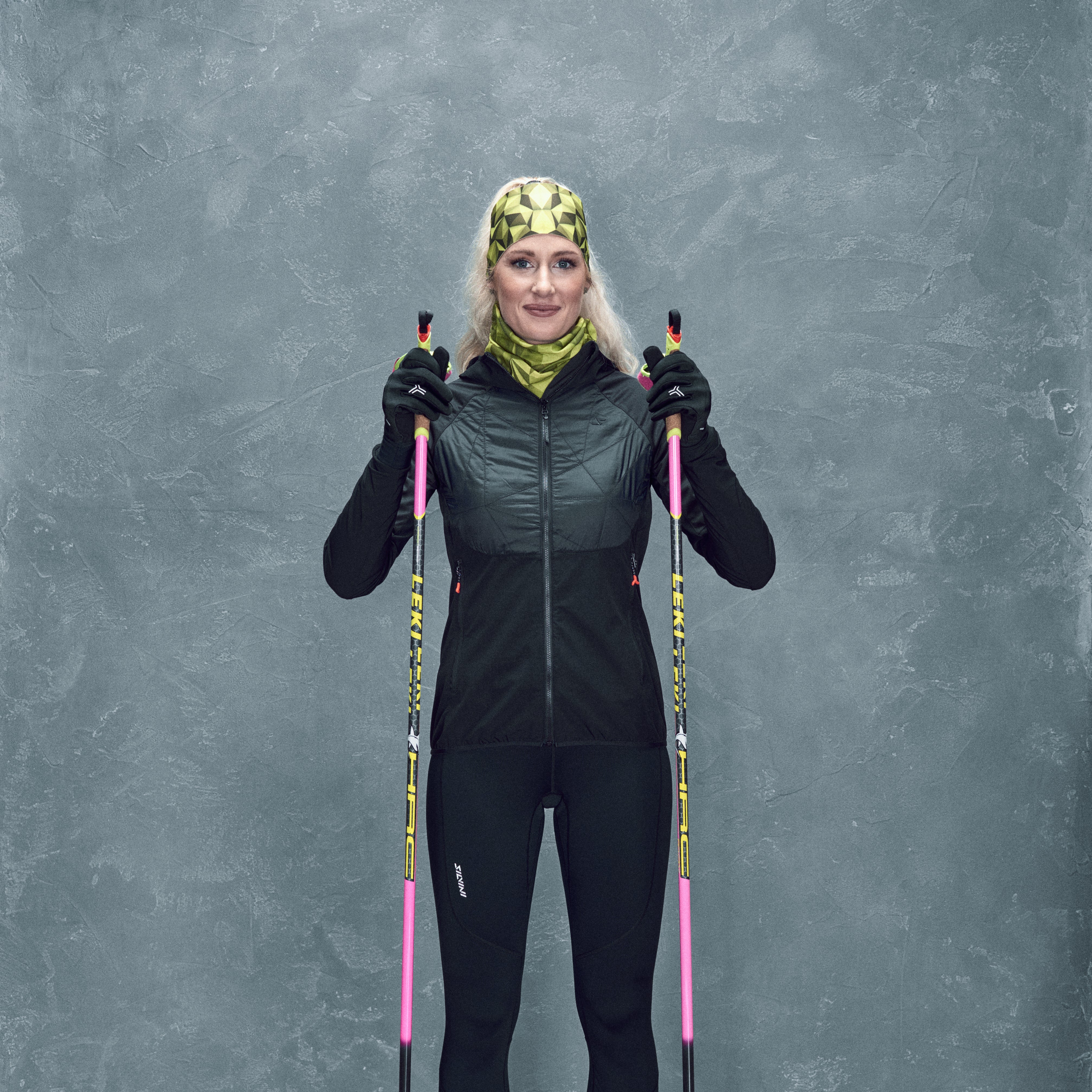 Women’s elastic Rubenza pants made from insulated Powertherm. They provide warmth, freedom of movement, and moisture wicking for sports in cold weather.