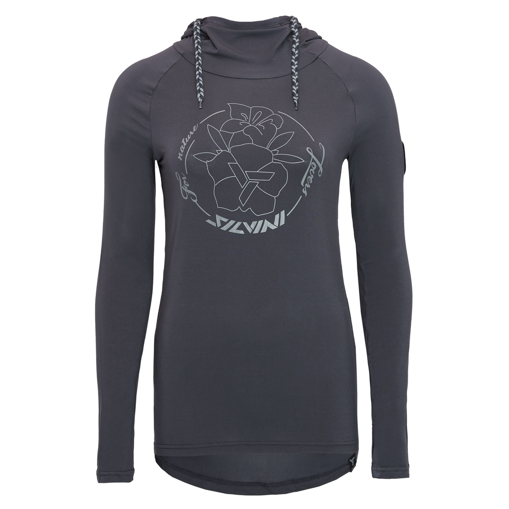 Merate women’s long-sleeve hoodie, lightweight stretch modal, seamless, moisture-wicking, longer back, thumbholes, reflective elements, stylish front print, ideal for sport and casual wear.