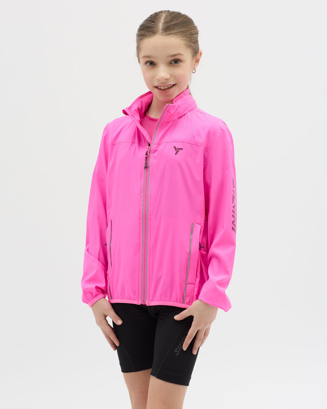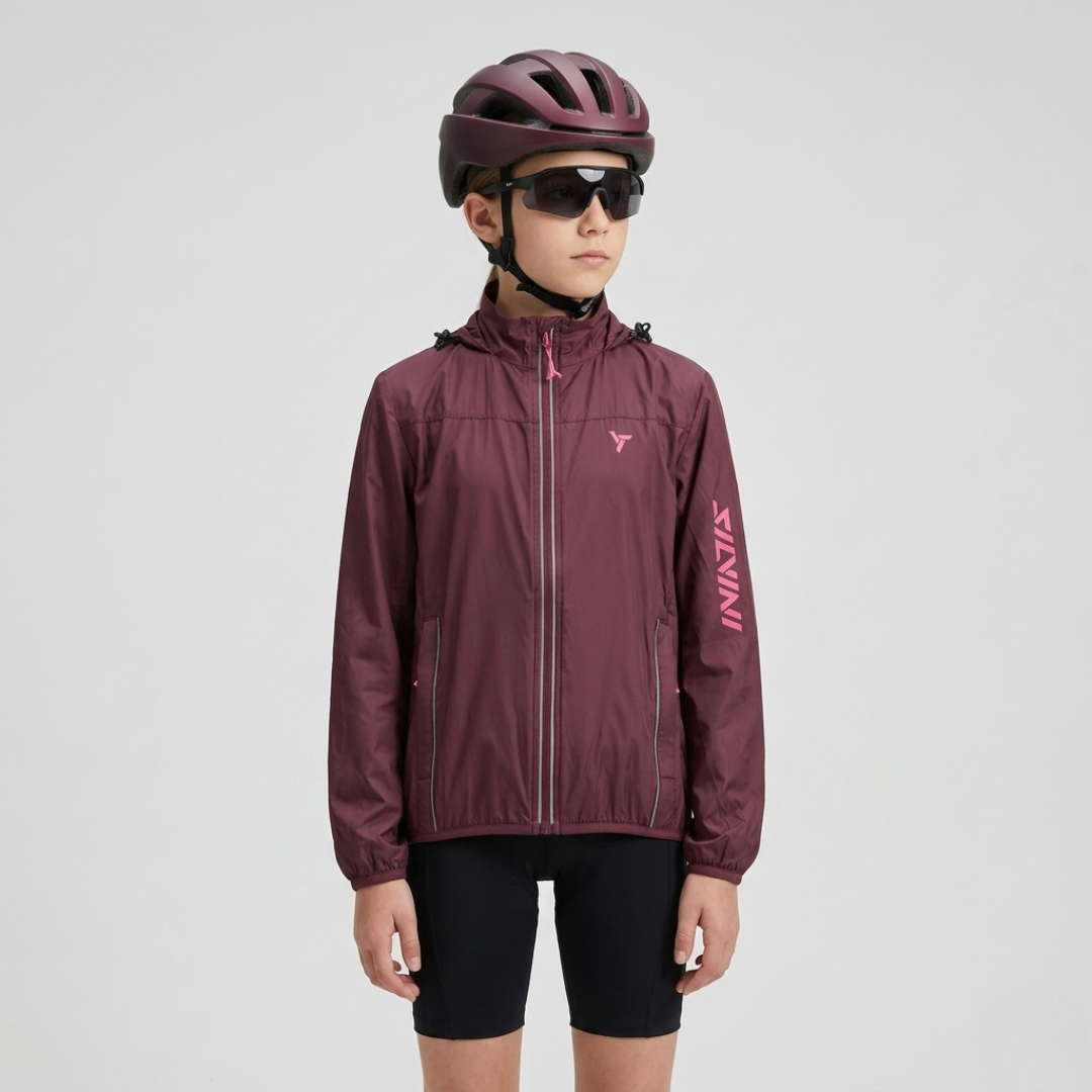 Children's sports windbreaker made of light windproof and densely woven Windbreaker material. Possibility to pack the hood into the collar or the entire jacket into a small bag. There are side pockets and reflective elements.