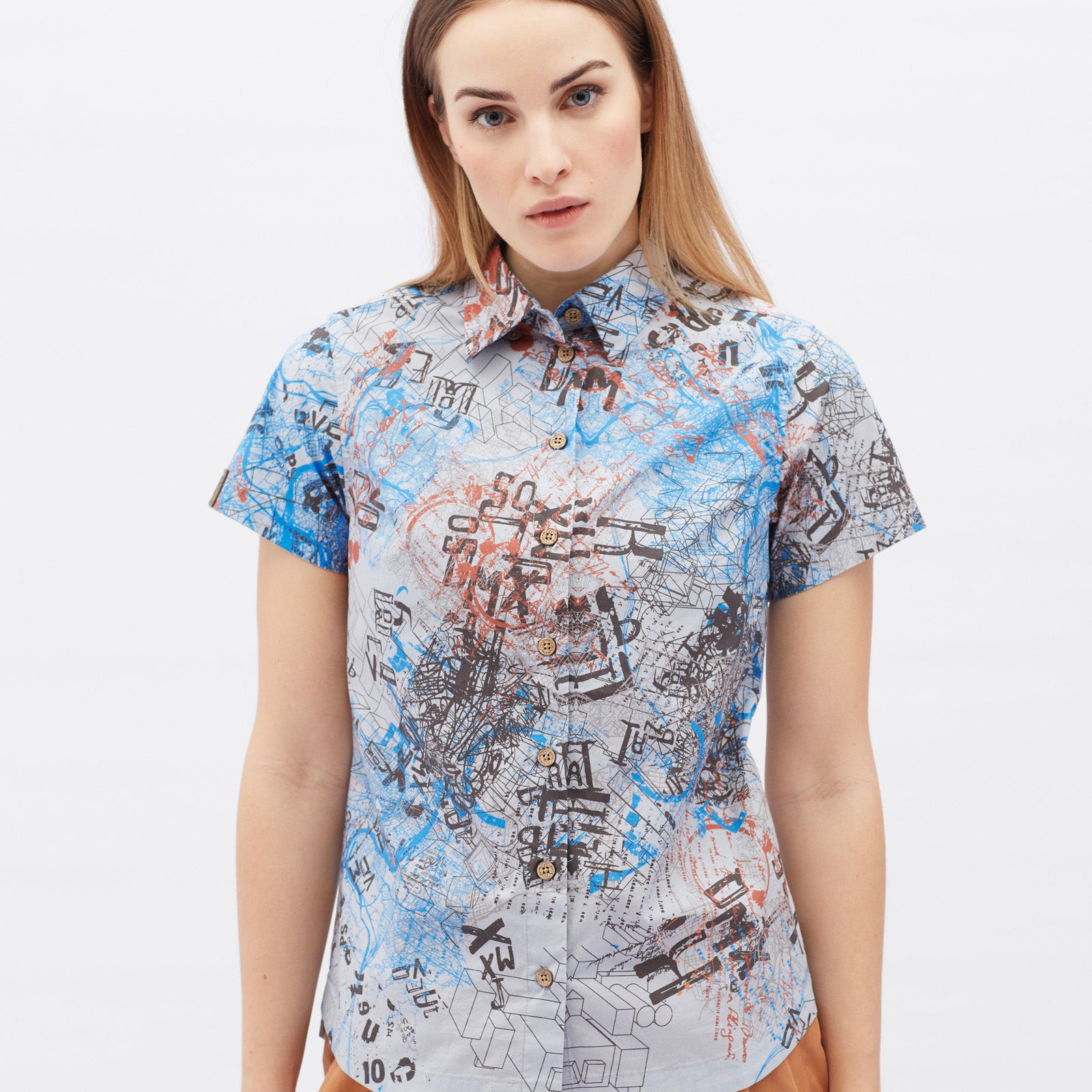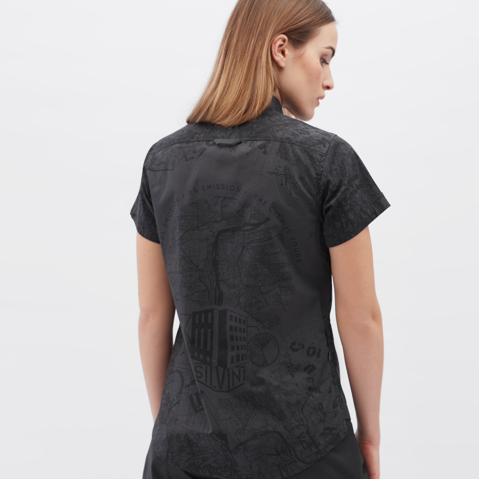 Montora women’s cotton shirt with short sleeves, extended back, pocket, and reflective details. Stylish and comfortable choice for city, cycling, and leisure.
